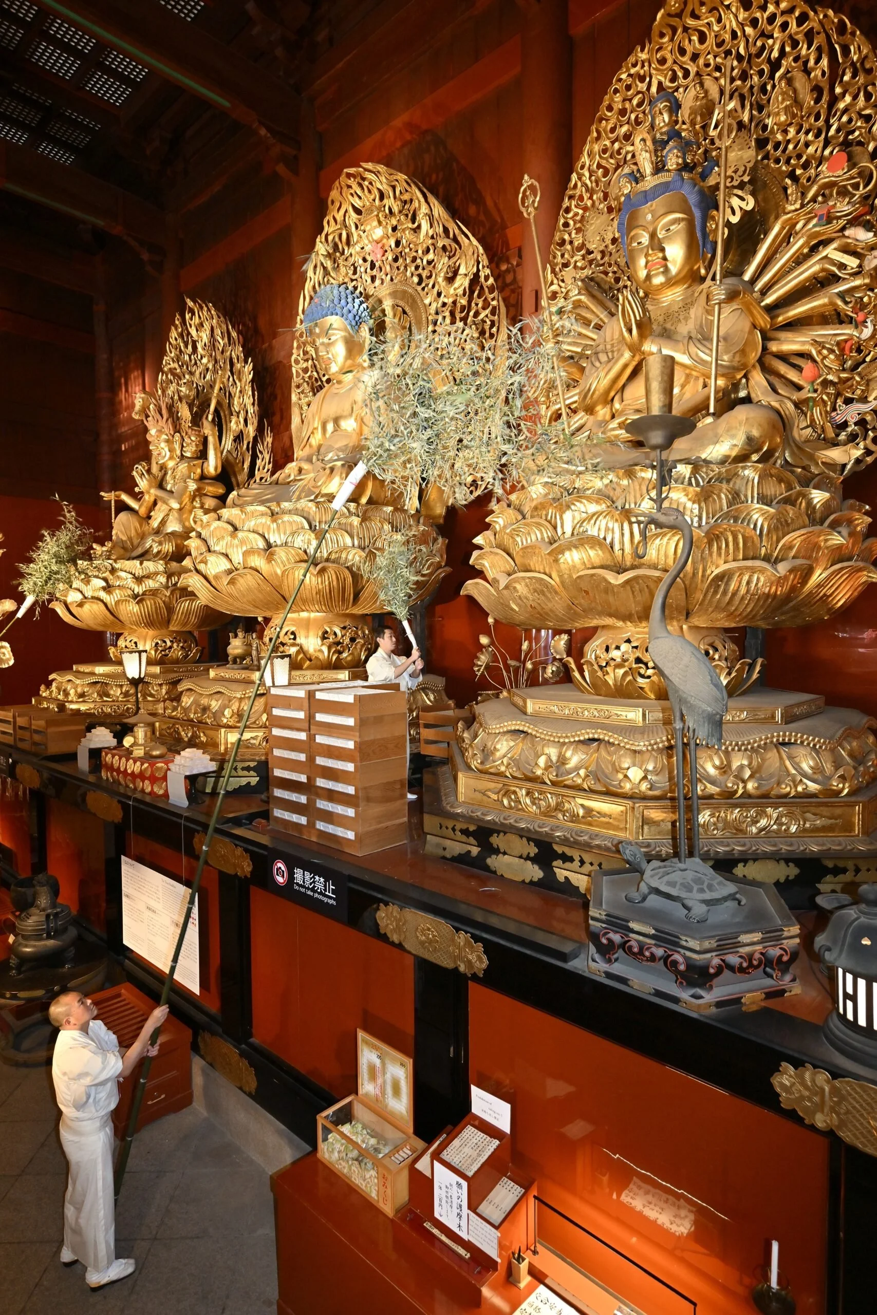 Three peaks: Mount Nantai, Mount Nyoho, and Mount Tarō. Nantai was read as a father-god, Nyoho as a mother-god, Tarō as a son — the mountains as a divine family. Each mountain deity was then assigned a corresponding buddha: Mount Nantai with the Thousand-Armed Kannon, Mount Nyoho with Amida the Buddha of Infinite Light, and Mount Tarō with the Horse-Headed Kannon. These three figures — seated at 7.5 meters tall, the largest wooden seated statues in eastern Japan — are what the Sanbuttsdō enshrines.