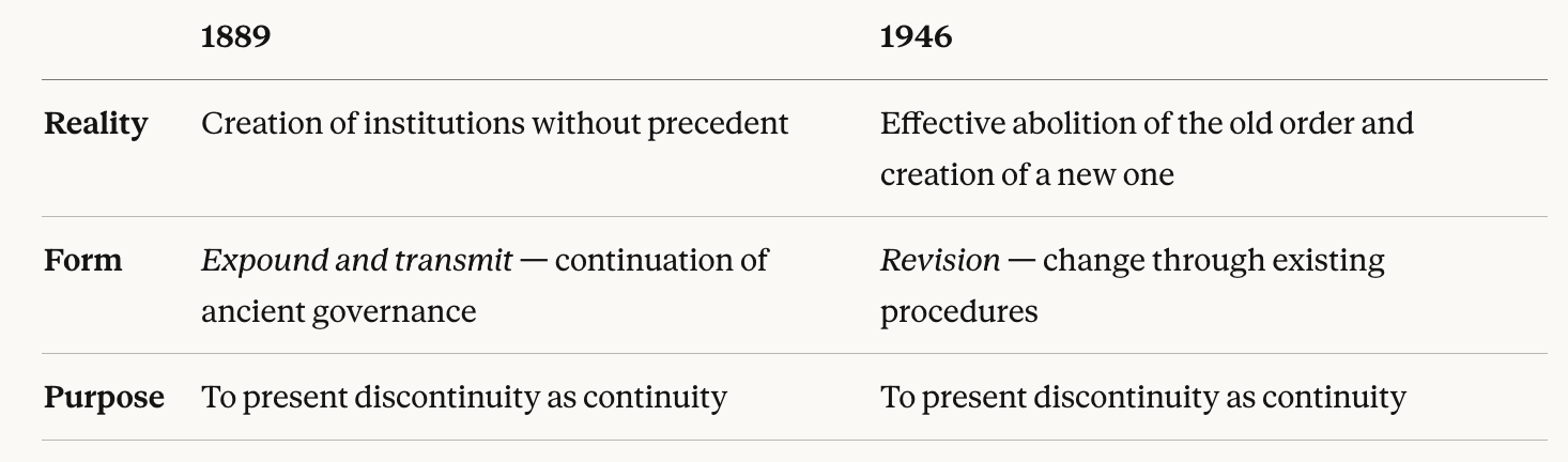In 1889, the Meiji Constitution came into being as an act of expounding and transmitting. In 1946, it ended through revision. Both words chose a form that differed from the underlying reality. And both choices functioned as answers to the question of legitimacy — or at least, were designed to function that way.