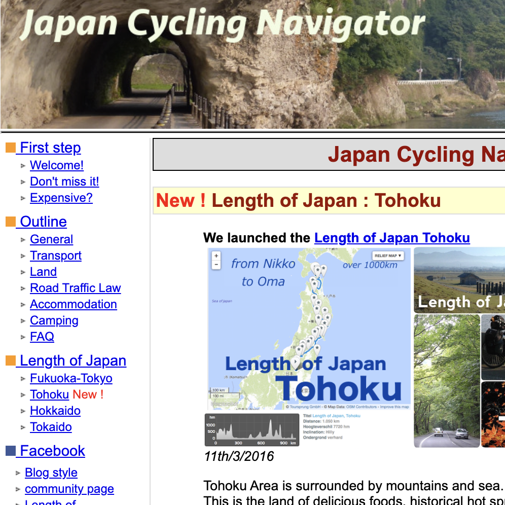 Japan Cycling Navigator is one of the most comprehensive English-language resources for cycling in Japan — built not by a tourism board, but by cyclists who actually know the roads. The site's centerpiece is 'Length of Japan,' a turn-by-turn route guide running from Fukuoka all the way to Hokkaido, with detailed breakdowns of road conditions, accommodations, and ferry crossings.