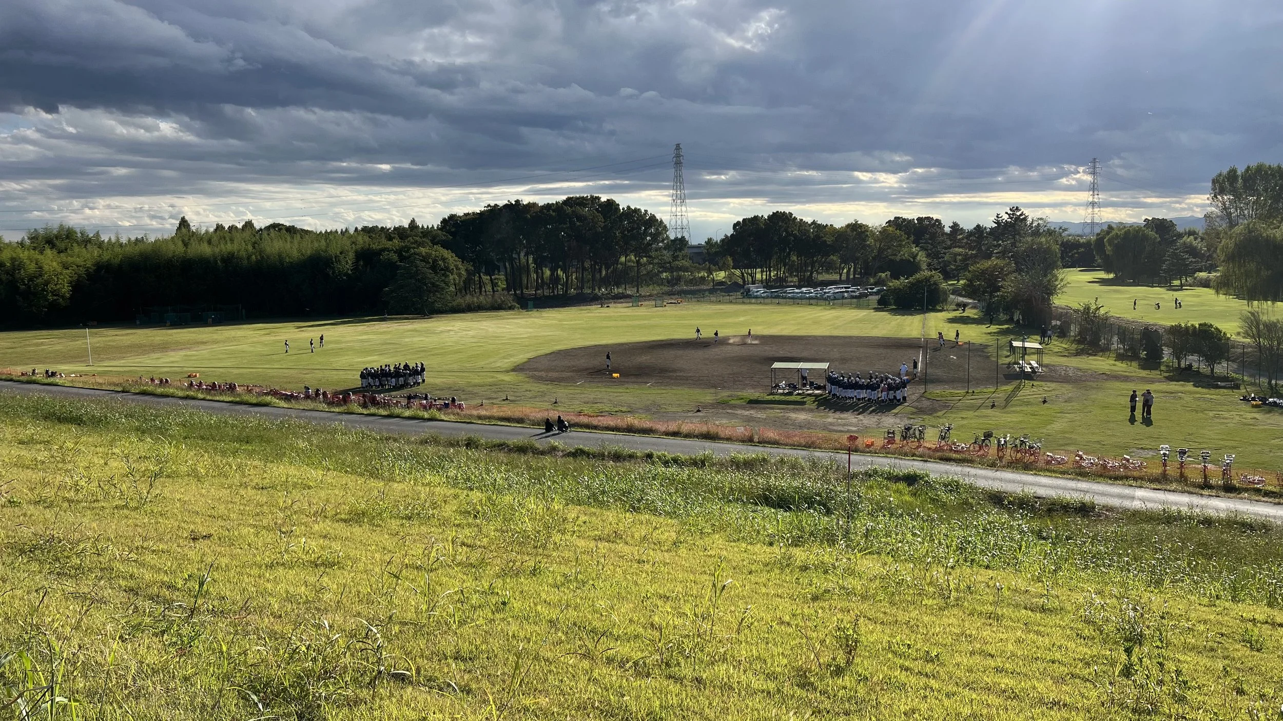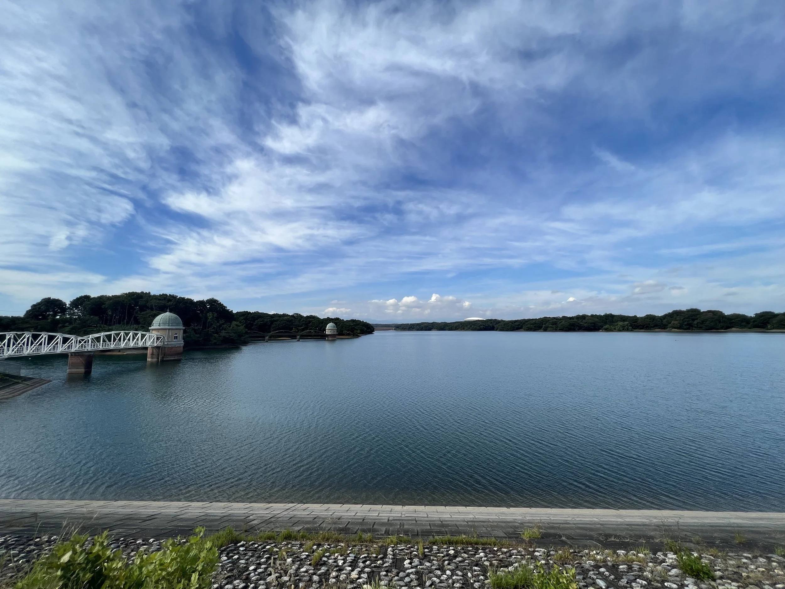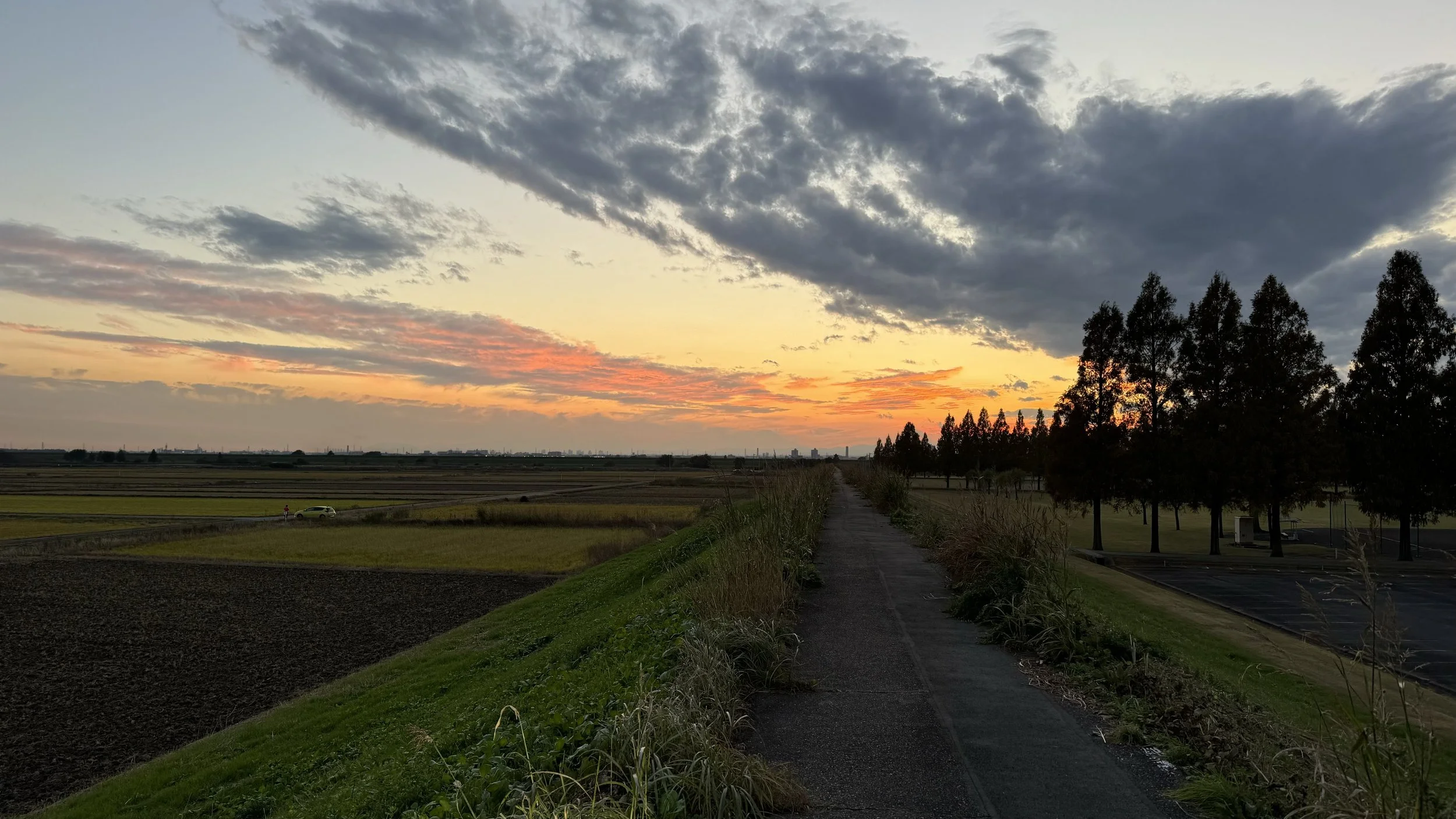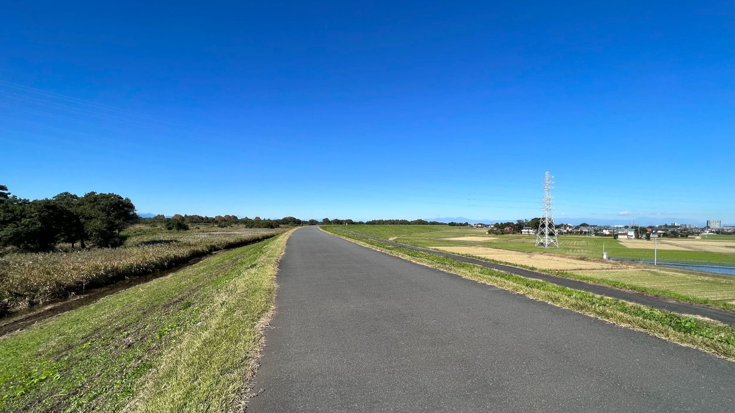 The embankment path runs straight to the horizon, open on both sides. Living in a city like Tokyo, you forget how big the sky can be. Out here, it comes back to you.
