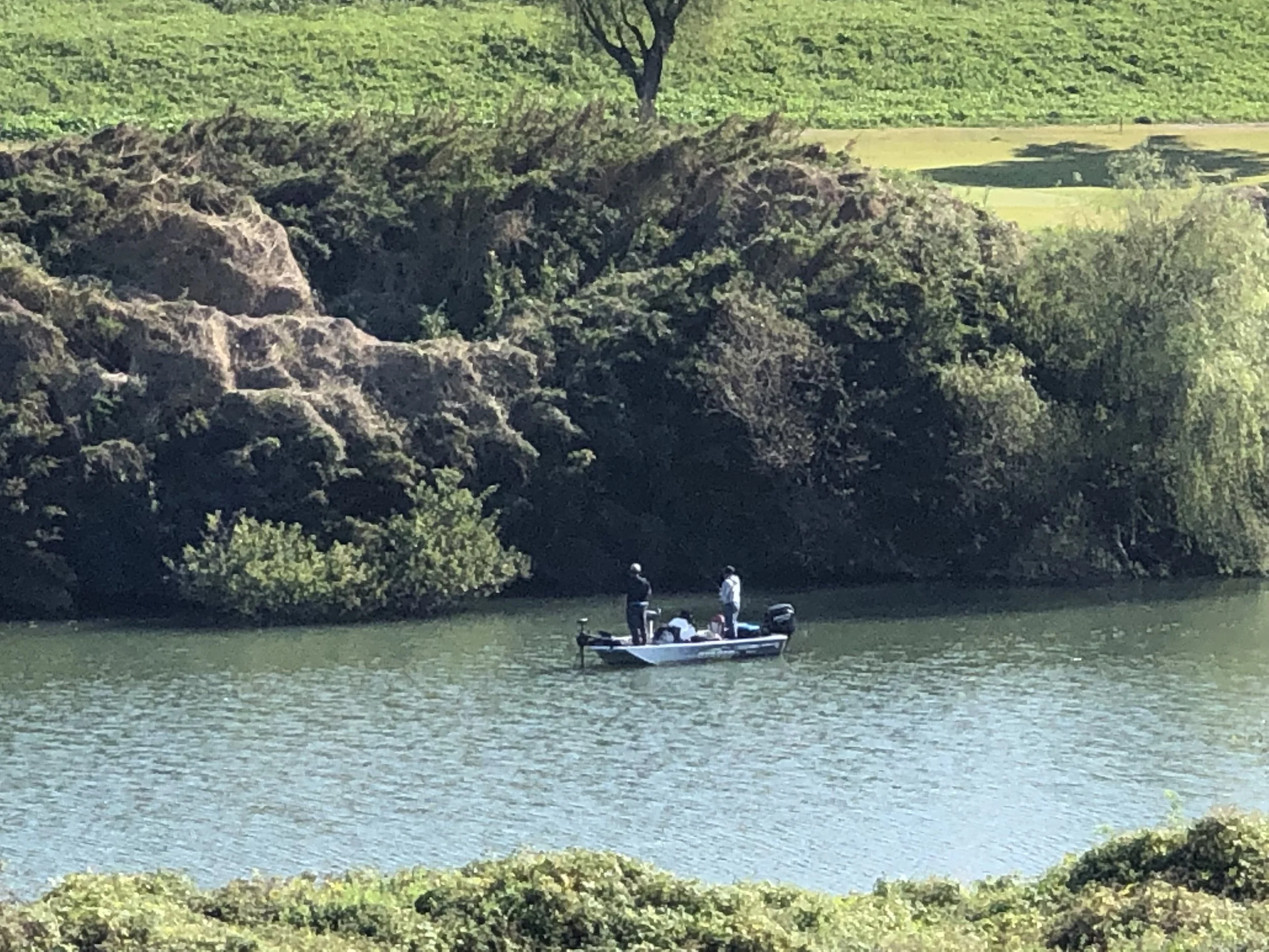 …bass fishermen drifting in flat-bottomed boats along the bank…