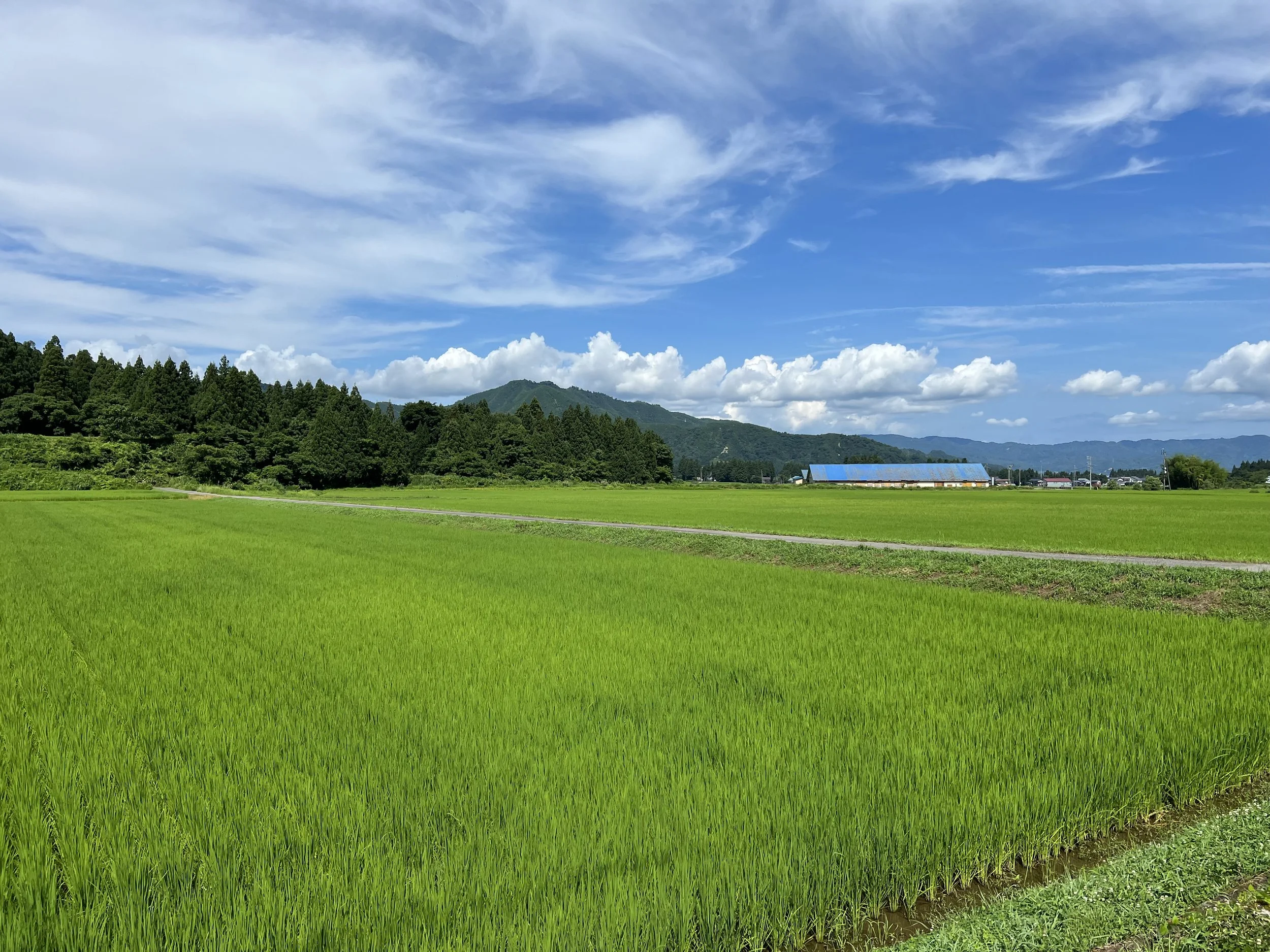 Minami-Uonuma, Niigata — rice country. In summer the heat sits heavy on the valley, but the paddies stretch in every direction and when the wind moves through, the whole field moves with it — and a moment later, so do you.