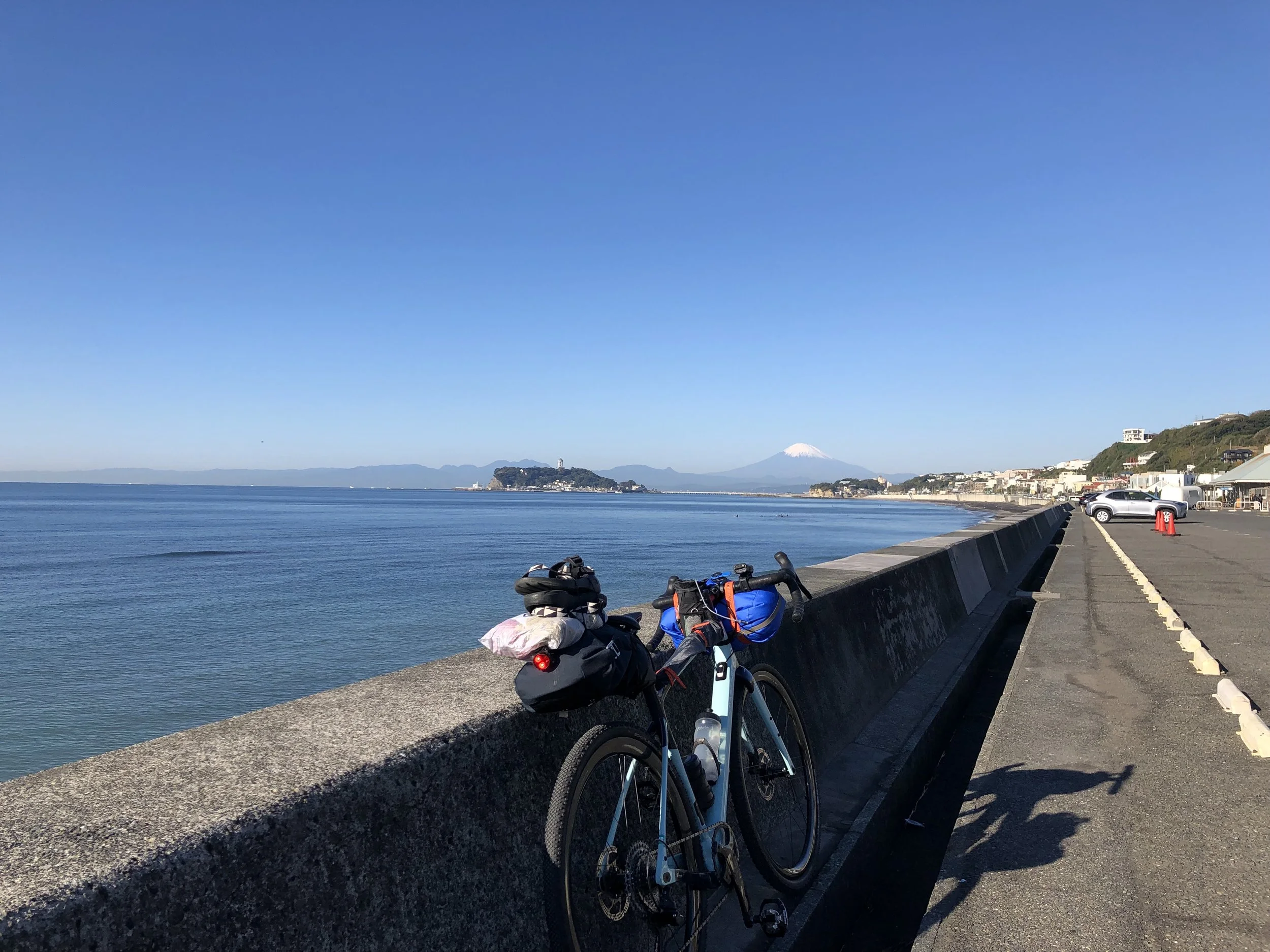 On a clear winter morning, the mountain sits above the water with the kind of clarity that makes you stop pedaling. Enoshima rises from the bay to the east — island, lighthouse, bridge — and the whole scene looks almost too composed to be real.