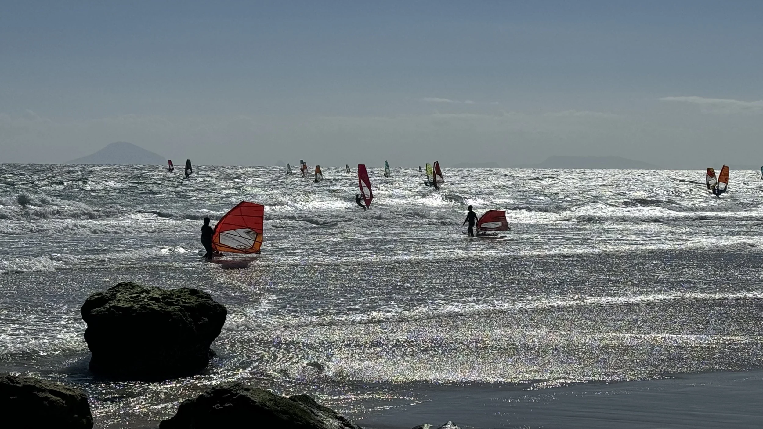 Shirahama beach, on the eastern tip of the Izu Peninsula. On a windy day, the water fills with windsurfers — sails catching the light, the whole bay in motion. On the horizon, the outline of Oshima island sits against the sky. Oshima is a volcanic island about 100 kilometers offshore; on a clear day it appears closer than that, as if it had drifted in overnight.