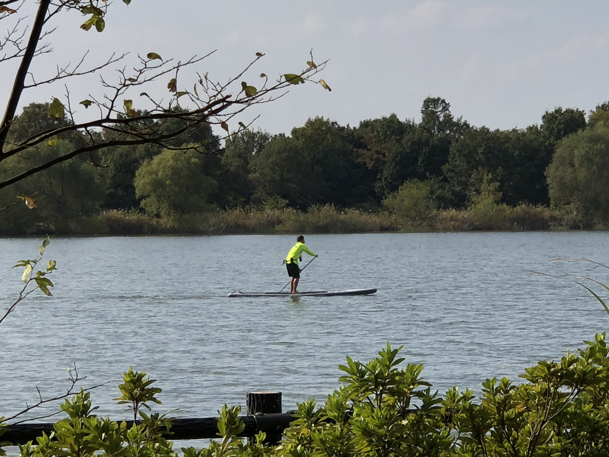 A SUP paddler on the reservoir at Saiko-Doman Green Park — one of several spots along the Arakawa where the cycling path opens into a proper park. A loop trail runs around the water's edge for cycling and jogging. On weekends, the day-camping area fills up with families and the smell of charcoal drifts across from the BBQ pits. It's a good place to stop.