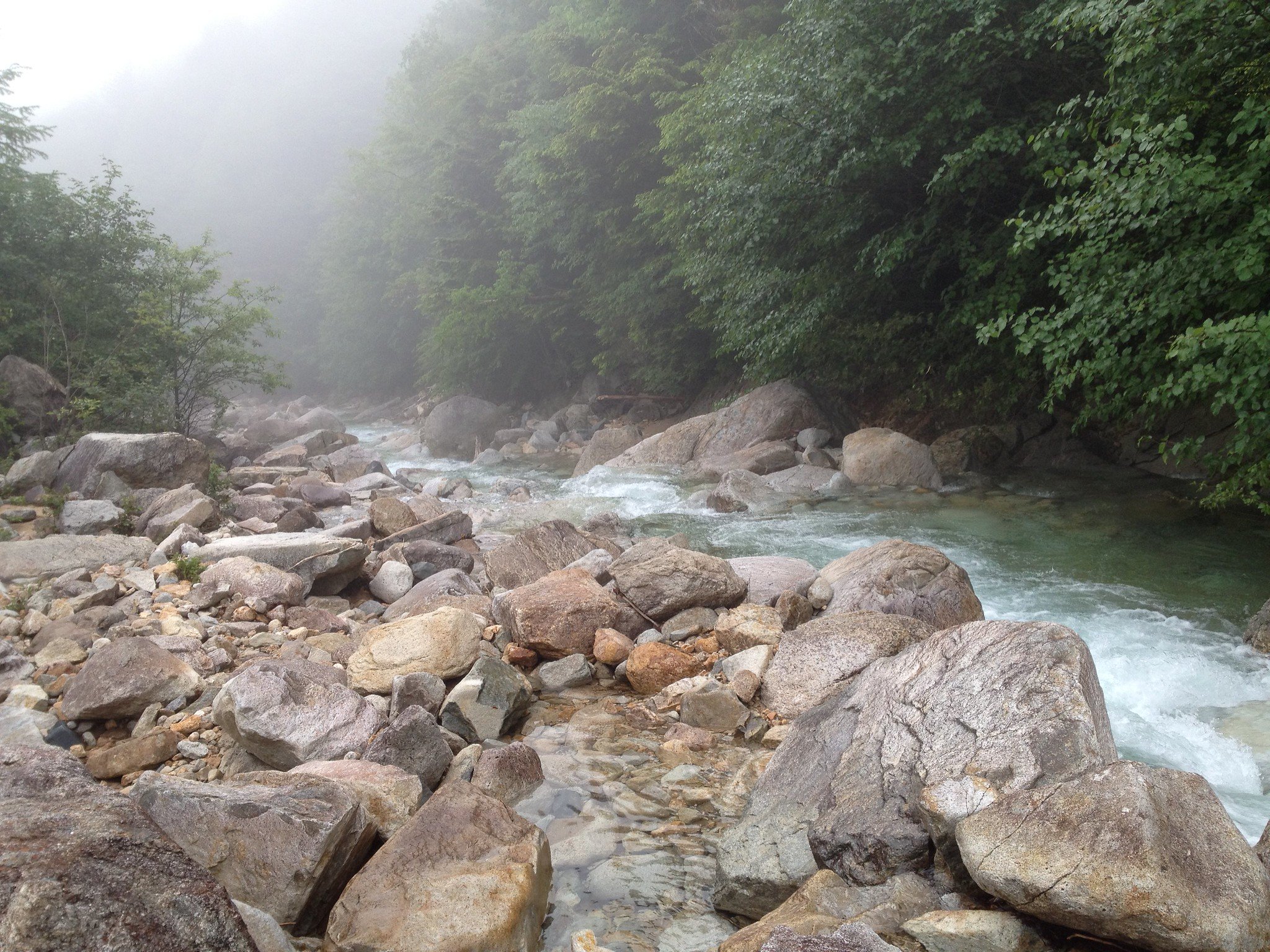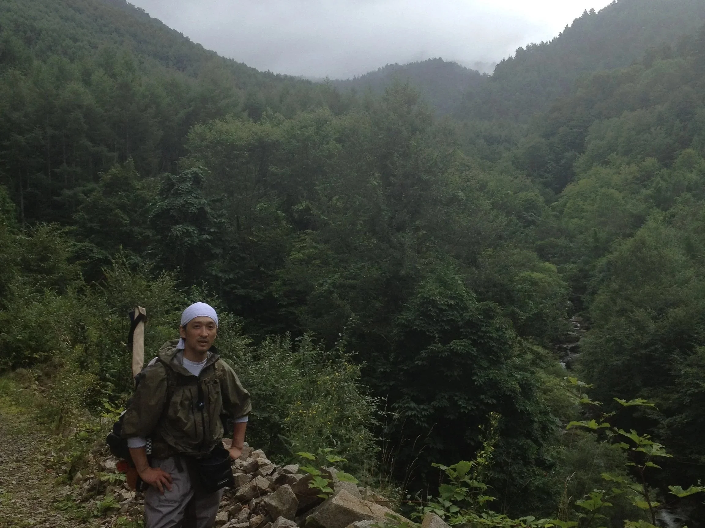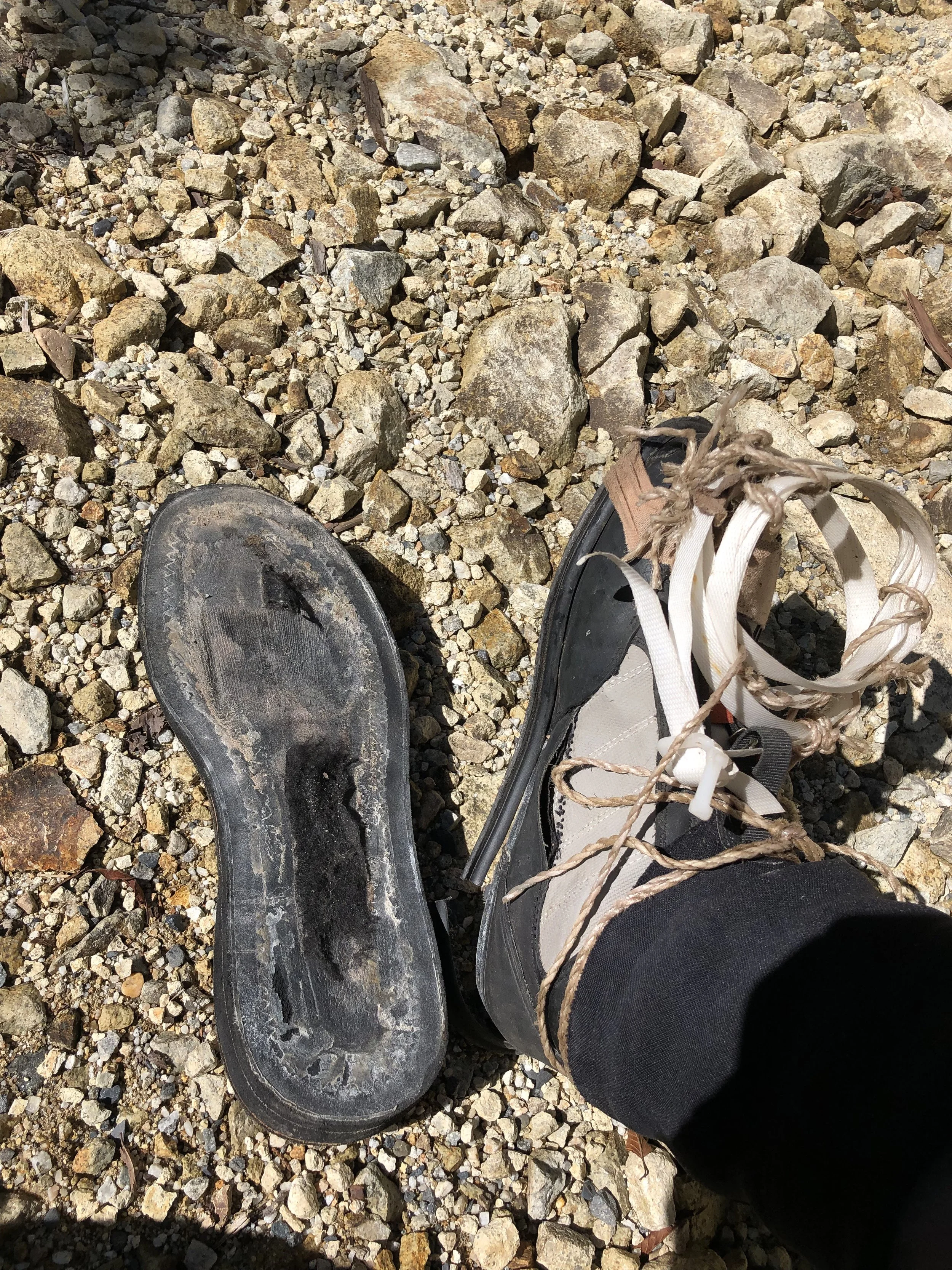 About an hour into the walk, the heel of my wading shoe began to separate. A soft, rhythmic slapping with every step — the sound of something coming apart. I stopped at what appeared to be a forestry depot and rummaged through the scraps: some twine, a strip of packing material. Improvised repairs were made. They held for a while. By the time we reached our destination, they had ceased to hold at all. The sole was gone. Walking on a riverbed of sharp, uneven rock in a shoe with no bottom is a particular kind of suffering — each step a small, precise punishment.