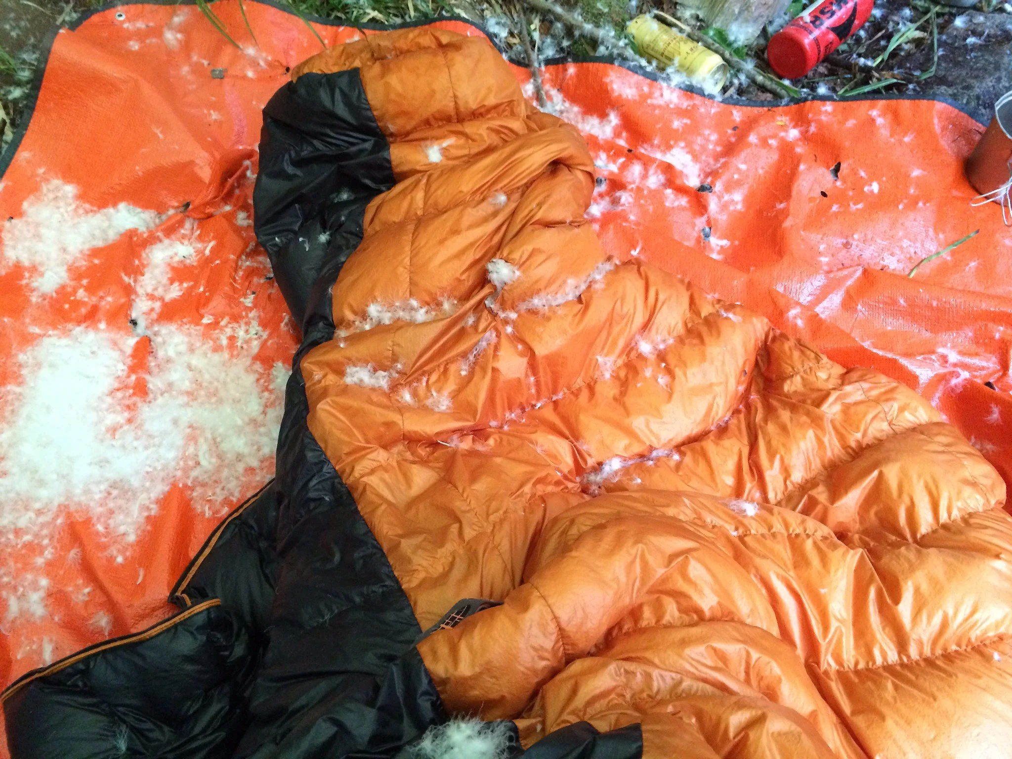 One night I was sleeping near the fire when something woke me — a sharp, sudden pain, and a smell of burning that I couldn't place. For a moment I didn't know what had happened. Then I understood: an ember had spat from the fire, landed on my sleeping bag, melted through the shell and the down, and reached my skin. In the morning, the campsite was scattered with feathers — the kind of scene that, in nature, means something didn't survive the night.